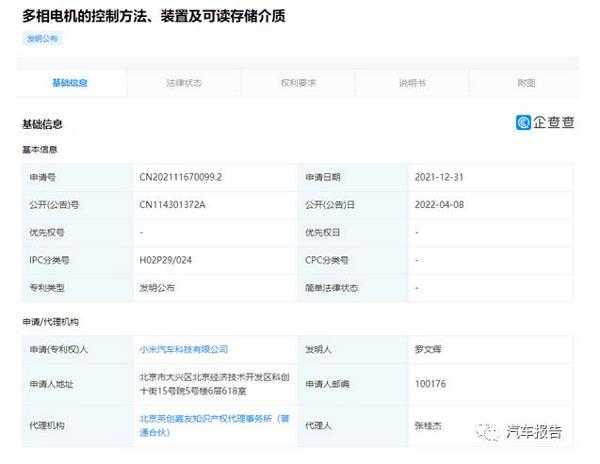 从企查查网站获悉,4月8日,小米汽车科技有限公司首个专利正式公开,申请日期为2021年12月31日,专利名称为“多相电机的控制方法、装置及可读存储介质”。 专利摘要显示,在多相电机发生缺相故障的情况下,获取所述多相电机的转子的当前位置;根据所述转子的当前位置,确定所述转子在所述多相电机的电压矢量空间中当前所属的目标区域,其中,所述电压矢量空间被预先划分为多个区域,所述目标区域为所述多个区域中的一个区域。