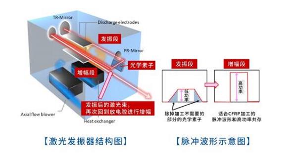 ※1 Carbon Fiber Reinforced Plastics ※2 2021年10月14日本公司调查 世界首次,搭载独创结构的二氧化碳激光发振器,实现世界最快级别的高速加工 ·配备Integrated-MOPA※3方式的三轴正交型※4二氧化碳激光发振器,将振荡器和增幅器集成在同一个框体中,通过简单的结构发出适于CFRP加工的激光(已申请专利),解决了迄今为止难以实现的CFRP的精密加工的问题。 ·碳纤维和树脂的熔化温度不同,切割CFRP需要激光加工机具有陡峭脉冲波形和高功率输出,而CV系列产品可同时满足这两个要求,实现更快级别的加工速度※5,速度约为切削加工和水射流加工等现有处理方法的6倍,有助于提高生产效率。 ※3 Master Oscillator Power Amplifier:主发振器功率增幅器 ※4激光光轴、气流及放电方向三者相互垂直的结构 ※5在切割厚度为2mm的热固性CFRP板材时,相对切削加工的切割速度1m/min,激光加工的切割速度达到了6m/min