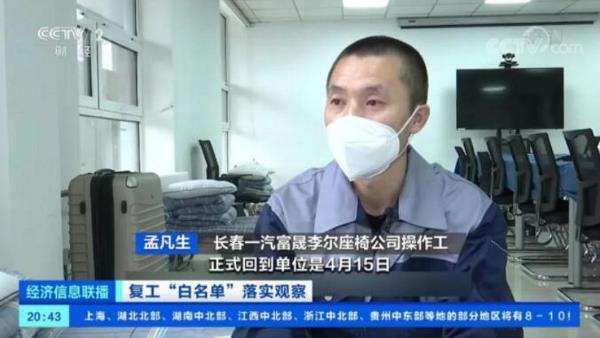 南京大学长江产业经济研究院院长 刘志彪:产业它是一个体系,上下游去配合才能复工,因此复工必须是全产业链复工,任何一个地方单独复工都会面临着瓶颈的问题。各地制定的加码的政策使得统一市场分割得零零碎碎,不是一个统一市场,变成一个非常分割的没有效率的市场,所以会严重影响经济的运转。 在上海列入要迅速开工要保的白名单企业有666家,但到了本周,刚一开始的时候,真正开工的企业刚过一半,到本周五也才到七成。除了物流不畅,原材料短缺等方面的原因,人员到岗困难也是一大阻力,比如手里有证,小区不放人……人回不来,企业当然没法更好地复工复产,而有一些地方还存在着复了工却没法复产,因为短缺的还不只是人,这方方面面的问题又该怎么破局呢? 返岗“白名单”:企业复工复产进展如何? 复工复产,对于需要赚钱养家的一线职工来说,显得尤为迫切。在长春的一家汽车座椅企业里,本周四已是操作工孟凡生复工的第四天。他是发泡车间的一名操作工,他的妻子是同一个车间的工人。停工的一个月里,没了收入来源的老孟,心里一天比一天发慌。直到长春市实现社会面清零的那一天,夫妻俩收到了复工的消息。 老孟所在的企业,是为一汽集团提供座椅的配套企业,也因此被列入吉林省复产员工返岗的“白名单”。按照要求,工信部门需要第一时间把员工返岗白名单,发放给所在社区,目的就是最大限度简化员工放行条件,提高返厂效率。 长春一汽富晟李尔座椅公司总经理 李兆国:我们选择员工,第一个是按照政府划分的防范区、无疫小区,优先选择这些员工。然后根据工人的意愿,首先经过工人同意,接着我们报给政府的工信部门,批准之后我们优先选择这些员工复产。返岗的人员住在事业部的研发中心,静止隔离三天以上,在抗原试剂盒检测还有核酸检测都正常情况下,才允许回到我们的装配线上。 复工后,最让老孟牵挂的,是家里的父母和正在读高三的女儿。夫妻俩都不能回家,女儿还没复课,一直在家里上网课。距离高考只有一个多月,老孟非常担心女儿的学习和心理状况。
