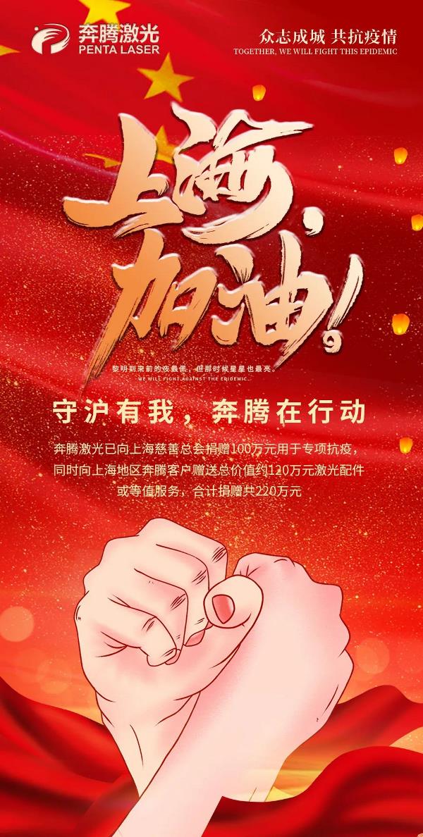 目前,奔腾激光已向上海慈善总会捐赠100万元用于专项抗疫,同时经过领导层研究决定,向上海地区奔腾客户赠送总价值约120万元激光配件或等值服务,合计本次捐赠共220万元。