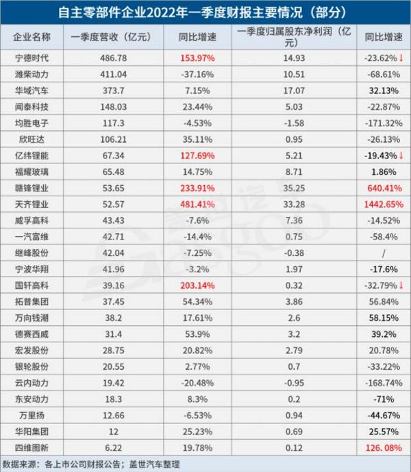 锂矿企业业绩暴涨,动力电池企业“增收不增利” 在此次统计的众多企业中,“锂矿双雄”赣锋锂业与天齐锂业可谓“大赢家”。赣锋锂业一季度实现营业收入53.65亿元,较去年同期增长超2倍,净利润达到35.25亿元,同比大涨超6倍。天齐锂业增速更猛,一季度实现营业收入52.57亿元,较去年同期增长近5倍,净利润达到33.28亿元,同比暴增超14倍。 这一表现自然离不开一季度新能源车市高速增长下上游材料需求的持续增长。业界周知,今年一季度,受疫情反复、需求收缩等多因素影响,我国整体车市表现并不太理想。据中汽协数据,一季度我国累计汽车产销分别达648.4万辆和650.9万辆,同比增长2.0%和0.2%,增速较1-2月回落6.8个百分点和7.3个百分点。不过在此局势之下,新能源车市“风景独好”,一季度新能源汽车产销分别达到129.3万辆和125.7万辆,同比均增长1.4倍。 当然,相较于市场需求的提升,锂材料价格的快速上涨,是锂矿企业盈利暴涨的更关键原因。相关数据显示,2022年初,电池级碳酸锂、电池级氢氧化锂每吨的价格较上年同期上涨近8倍,锂辉石、六氟磷酸锂等每吨的价格上涨约4倍,电解钴、523三元材料、磷酸铁锂材料、三元电池电解液等的价格也同步飙升了数倍,这直接提升了锂矿企业的毛利率水平。 不过值得注意的是,在赣锋锂业等锂矿企业受益于此而业绩大涨的同时,动力电池企业却因此业绩受损。 诚然,新能源车市的火热,直接拉升了动力电池需求,这带动了相关厂商营收的上涨。在此次所统计的众多企业中,这一类企业营收增势也十分可观。例如以一己之力扛起国内动力电池半边天的宁德时代,一季度营收已经达到486.78亿元,较去年同期大增153.97%。亿纬锂能、国轩高科的营收虽与宁德时代不在一个量级,但增速都明显较高,一季度亿纬锂能同比增幅达到127.69%,国轩高科更是同比大涨了203.14%。 但一个明显的现象是,不同于此前营收净利齐增的局面,上述企业在一季度均遭遇了净利的下滑,且营收增速越高的企业,净利下滑得越厉害。而原材料价格飙升导致成本持续上行,正是此类企业盈利水平下降的“罪魁祸首”。 在宁德时代一季度业绩解读会上,宁德时代董事会秘书、副总经理蒋理坦言,2021年以来碳酸锂的涨价,为公司的经营带来了压力,但作为动力电池的龙头企业,为了维护行业的发展,一季度公司承担了主要的原材料涨价压力,这是其毛利率下滑的主要原因。 亿纬锂能净利的下滑与参股公司思摩尔国际利润下滑相关,同时因动力电池业务是其最大收入来源,碳酸锂等上游原材料价格上涨促使其毛利率下滑。据悉,受上游原材料价格上涨影响,一季度亿纬锂能的毛利率已下降至13.7%,而2021年其毛利率为21.57%。 国轩高科亦受原材料涨价拖累而出现毛利率下滑。据财报数据,国轩高科2021年全年销售毛利率达到18.61%,今年一季度这一比例下降至14.49%。有业内人士表示,该公司成本端扩产带来的规模优势被以碳酸锂为主的上游原材料涨价稀释,毛利率由此受损。 当然,为了缓解原材料价格上涨所带来的成本压力,不管是宁德时代,还是亿纬锂能、国轩高科等动力电池厂商都已经与下游客户协商调价,以推动盈利的逐步恢复。 蒋理在近期的业绩说明会上表示,宁德时代目前已基本完成与客户的协商调价,将在第二季度逐步实施落地,毛利率的恢复也是持续过程。亿纬锂能亦在其业绩说明会上表示,二季度净利润可以恢复到常态水平。国轩高科同样在投资者电话交流会上表示,与客户友好协商调价比较顺利,涨价是动态调整的,并已在陆续落地,“毛利率的恢复是一个持续过程,相信在合理的预期内,公司的盈利水平会有合理修复。” 不过动力电池企业们显然知道,面对原材料价格上涨所带来的持续性影响,将成本压力向下游整车厂传导并非长久之计,通过加强产业链上游布局,来保障原材料的供应并提升在上游的话语权,尤为重要。事实上,宁德时代、亿纬锂能、国轩高科等不少动力电池企业已经展开了行动, 以国轩高科为例,该公司近日与阿根廷胡胡伊省国家能源矿业公司签署战略合作协议。根据协议,国轩高科与JEMSE将合资在胡胡伊省保税区兴建一座电池级碳酸锂精炼厂,后者将提供勘查面积约17000公顷的潜在锂矿产资源探矿及采矿权,保障资源供应。双方还将展开锂电产业下游业务合作,包括正极材料、电池制造等。此前3月,国轩高科还曾公布,公司计划在肥东投资建设动力锂电池上游原材料及电池回收等项目生产基地。 “新潮”企业增长稳健,“传统”企业增长空间待打开 既增收又增利的不仅仅只有“锂矿双雄”。在盖世汽车此次统计的企业中,有部分企业业绩增速虽远远不及赣锋锂业尤其是天齐锂业,但却实现了营收与净利的双增长,且增幅还算不错,例如拓普集团、德赛西威、华域汽车等。 具体来看,拓普集团一季度营收达到37.45亿元,较去年同期增长54.34%,归母净利润3.86亿元,同比上涨56.84%;德赛西威一季度营收为31.4亿元,同比增长超五成,归母净利润为3.2亿元,同比上涨近四成;华域汽车一季度实现营收373.7亿元,同比增长7.15%,归母净利润17.07亿元,同比上涨32.13%。 而梳理上述企业财报可以发现,这些企业的业务范畴虽不同,但业绩表现均受益于汽车电动化、智能化方向的前瞻布局。 据悉,拓普集团目前共拥有八大系列产品,分别是汽车NVH减震系统、内外饰系统、车身轻