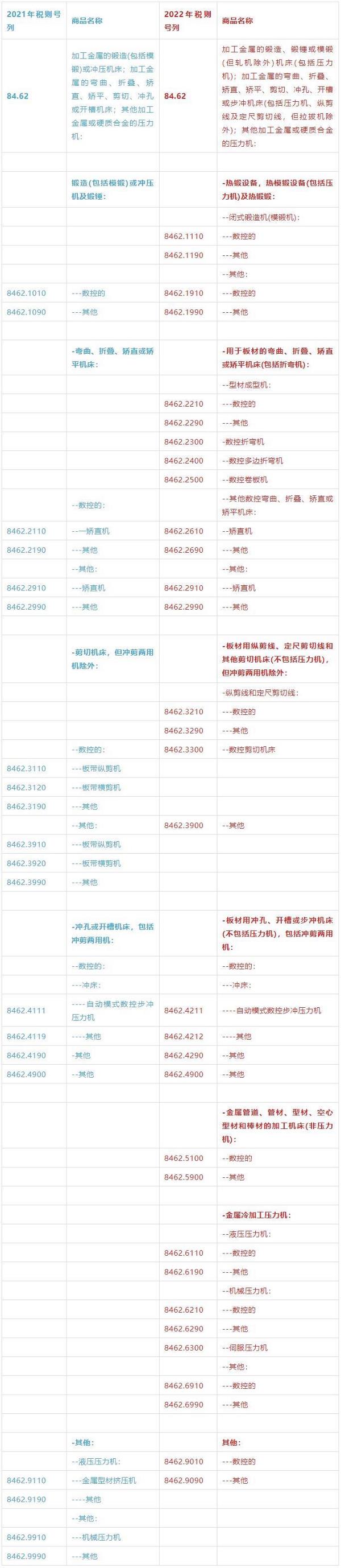 在已发布的2022年版税则中,金属成形机床、增材制造设备相关税则号有较大变化。现将机床工具行业相关商品税则的变化情况编辑整理如下,供行业企业参考。 一、成形机床 本次修订是在国际海关组织对成形机床六位子目进行转制的框架下完成的。主要是更加详细界定了8462品目的金属成形机床范围,明确区分了冷热加工工艺设备,并且根据技术发展和加工零件类别对税则进一步细分,与2021年版相比,累计增列了12个八位商品税则号列。