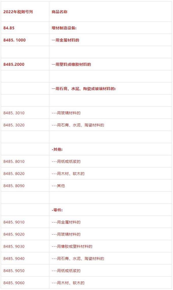 注释:品目84.62用于板材的“纵剪线”是由开卷机、矫平机、纵剪机和收卷机组成的生产线;用于板材的“定尺剪切线”是由开卷机、矫平机和剪切机组成的生产线。 二、增材制造设备 删除了原列在8477品目下橡塑加工机器中的“三维打印机”,新增“增材制造设备”品目8485,并根据设备所使用的材料以及所加工零件的材料设定了子目。 ![]() 注释:品目84.85所称“增材制造”(也称3D打印)指以数字模型为基础,将介质材料(例如,金属、塑料或陶瓷)通过连续添加、堆叠、凝结和固化形成物体。 三、工业机器人 在8428品目——“其他升降、搬运、装卸机械(例如,升降机、自动梯、输送机、缆车)”项下,增列了8428.7000工业用机器人。 四、工业用钻石 工业用钻石原税号7104.9011,替换为7104.9110。 来源:中国机床工具工业协会cmtba |