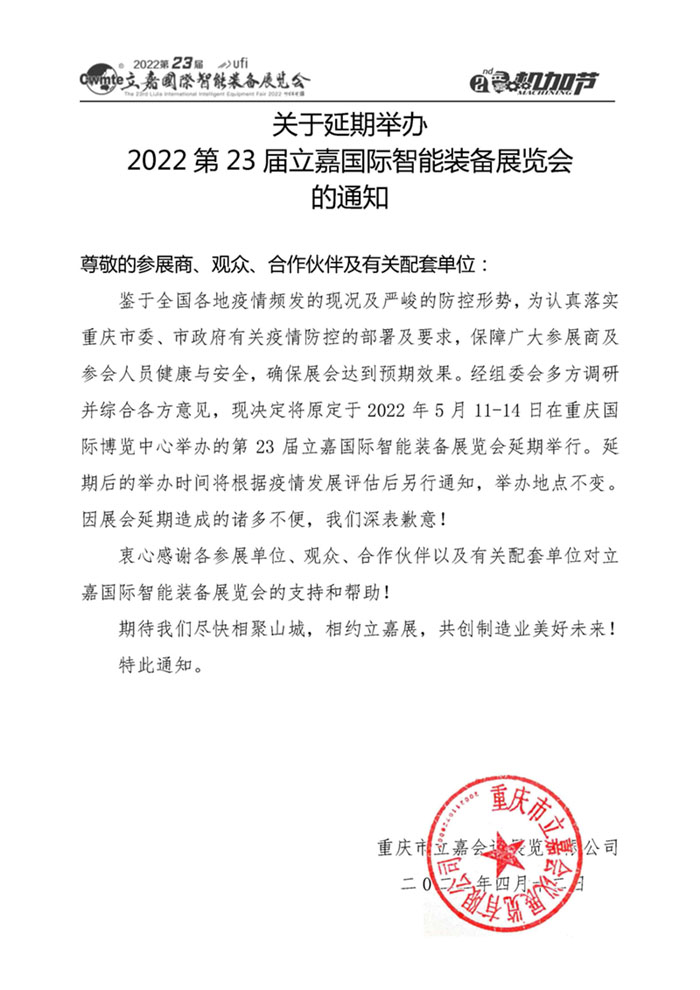 关于延期举办2022第23届立嘉国际智能装备展览会的通知