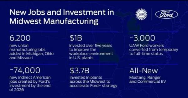 6月2日,福特宣布将在密歇根州、俄亥俄州和密苏里州投资37亿美元,新增6,200多个工会制造岗位,并将近3,000名全美汽车工人联合会-福特(UAW-Ford)临时员工转为永久全职员工,并在就业第一天为所有小时工提供医疗福利。 福特将在密歇根州投资20亿美元,并新增3,200个工会岗位。其中,福特将在密歇根州的三家装配厂新增近2,000个工作岗位,以将迪尔伯恩(Dearborn)Rouge电动汽车中心全新F-150 Lightning电动皮卡的年产量提高到15万辆,并在韦恩(Wayne)的密歇根装配厂生产全新Ranger皮卡,以及在Flat Rock装配厂生产全新Mustang轿跑车。 福特将投资3,500万美元在密歇根州门罗(Monroe)新建一个福特客户服务部门包装设施,并创造600多个工会岗位。该设施预计将于2024年开始运营,以加快向福特客户交付零部件。这笔投资包含在福特在密歇根州的总投资中。 福特将在俄亥俄州组装工厂投资15亿美元,并创造1,800个就业岗位,以在2025年左右开始组装一款全新的电动商用车。此外,福特将在利马发动机厂(Lima Engine)和沙朗维尔变速器厂(Sharonville Transmission)投资1亿美元,并新增90个就业岗位。 福特将在密苏里州堪萨斯城(Kansas City)装配厂投资9,500万美元,并提供1,100个工会工作岗位,以增加其美国最畅销的商用厢式货车Transit和全新E-Transit电动厢式货车的产量。 根据波士顿咨询公司(BCG)的一项研究,在37亿美元投资的支持下,UAW-Ford新制造岗位预计将在美国增加约7.4万个非福特公司的间接就业岗位。 福特此次投资和就业计划将支持Ford+战略。到2026年底,福特将通过Ford Model e在全球范围内每年生产200万辆电动车,同时加强公司Ford Blue汽油动力车的产品阵容。福特总裁兼首席执行官Jim Farley表示,“我们正在为美国的就业机会和员工投资,以打造新一代福特汽车,并继续Ford+转型计划。” 福特还计划在未来五年投资10亿美元,不断改善制造员工的工作体验。潜在的改进措施包括更好地提供健康食品,在工厂停车场安装新的电动汽车充电桩,改善停车场照明等。福特的改进措施会因工厂而异,而且未来还会有更多的变化。 来源:盖世汽车 |