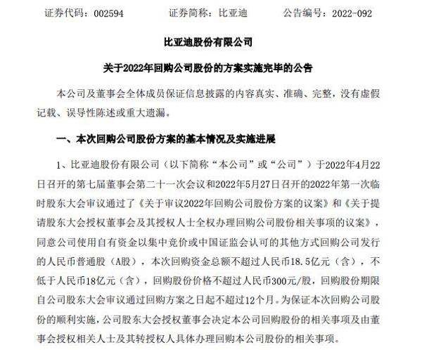 图片来源:比亚迪公告4月22日,比亚迪发布公告称,同意公司使用自有资金以集中竞价或中国证监会认可的其他方式回购公司发行的人民币普通股(A股),回购资金总额不超过18.5亿元(含),不低于18亿元(含),回购股份价格不超过300元/股。该回购方案于5月27日获得比亚迪2022年第一次临时股东大会审议通过。 随后,比亚迪开启了快速回购公司A股股份模式,仅花13天时间就斥资约18.1亿元回购超551万股公司股份。 6月1日,比亚迪首次通过回购专用证券账户以集中竞价交易的方式回购股份,回购A股股份的数量约145.21万股,占公司股份总数0.05%,成交价区间为293.37元/股~300元/股,成交总金额约4.33亿元(不含交易费用)。 6月2日,比亚迪发布公告宣布,公司回购约72.04万股A股,回购价介于299.24元/股至300元/股之间,回购金额约2.16亿元。 6月8日,比亚迪发布公告称,公司董事会同意调整回购公司股份价格上限,将回购价格上限由不超过300元/股调整为不超过400元/股。