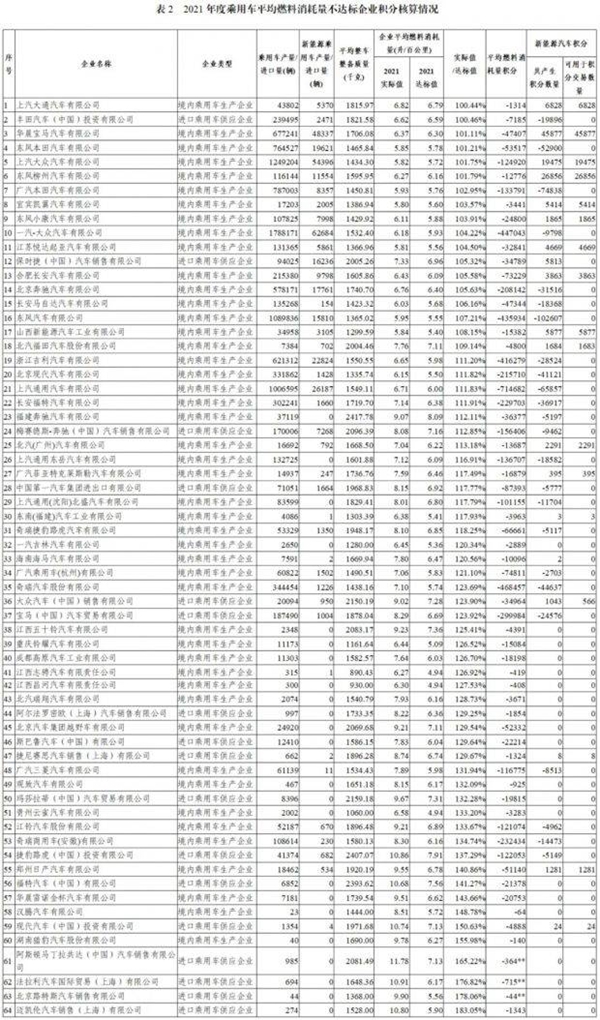 7月5日,工业和信息化部、财政部、商务部、海关总署、质检总局联合发布《2021年度中国乘用车企业平均燃料消耗量与新能源汽车积分情况公告》。 公告显示,2021年,中国境内129家乘用车企业共生产、进口乘用车2064.82万辆,行业平均整车整备质量为1533千克,平均燃料消耗量实际值(WLTC工况)为5.10升/100公里,较2020年降低15%以上,超额完成年度5.98升每百公里燃料消耗量的目标。 同时,129家乘用车企业中,2021年度乘用车平均燃料消耗量积分达标企业为65家,不达标企业为64家,达标率首次超过50%,去年同期仅为30%。具体来看,特斯拉和比亚迪依旧是积分大户,而自主品牌表现总体仍优于合资。其中,平均燃料消耗量积分榜第一是上汽通用五菱(254.72万分),上汽通用则成了倒数第一(-71.47万分)。此外,还有上汽通用、一汽大众、上汽大众、广汽本田等多家合资车企的平均燃料消耗量未能达标。与此同时,合资车企也是新能源汽车负积分榜单的常客。