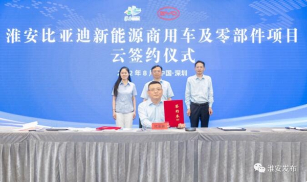 8月3日,淮安比亚迪新能源商用车及零部件项目云签约仪式举行。 市委书记陈之常,比亚迪股份有限公司总裁、董事长王传福致辞。市长史志军主持云签约仪式。市领导顾坤、赵权、王向红,比亚迪集团领导王杰、李巍、田春龙参加活动。 陈之常说:“这次云签约,是一场老朋友的聚会。淮安和比亚迪集团之间的合作由来已久,自2017年全面战略合作开启以来,双方互访不断、亲密无间,在新能源汽车推广、专用车生产、货车基地建设等方面建立了良好合作关系。” 近年来,比亚迪集团创造了令人钦佩的发展业绩。淮安牢固树立“项目为王、环境是金”工作导向,高效统筹疫情防控和经济社会发展,持续开展重特大项目攻坚,推动一批重量级、引领性的大项目、好项目相继开花结果,特别是百亿级制造业项目持续突破,为发展注入了强劲动能。 淮安与比亚迪集团携手并肩、互相成就,双方都取得了不错的成绩。 这次云签约,更是一段新合作的起点。在前期友好合作的基础上,比亚迪集团再次选择在淮安布局新能源商用车及零部件项目。 淮安将认真践行101%服务理念,集成政策、集聚资源打造最优营商环境,为比亚迪集团在淮发展提供全方位贴心服务,努力让比亚迪淮安项目成为标杆典范、引领示范。 淮安工业园区和市相关部门要全力做好帮办服务,推动项目加快落地建设。 我们也真诚希望以此次项目签约为新的起点,与比亚迪集团在更广领域开展合作。