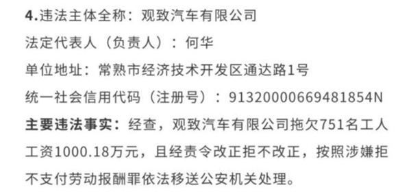 7月29日,常熟市人资社保局,通过官方微信公众号通报,观致汽车有限公司拖欠751名工人工资1000.18万元,且经责令改正拒不改正,按照涉嫌拒不支付劳动报酬罪依法移送公安机关处理。