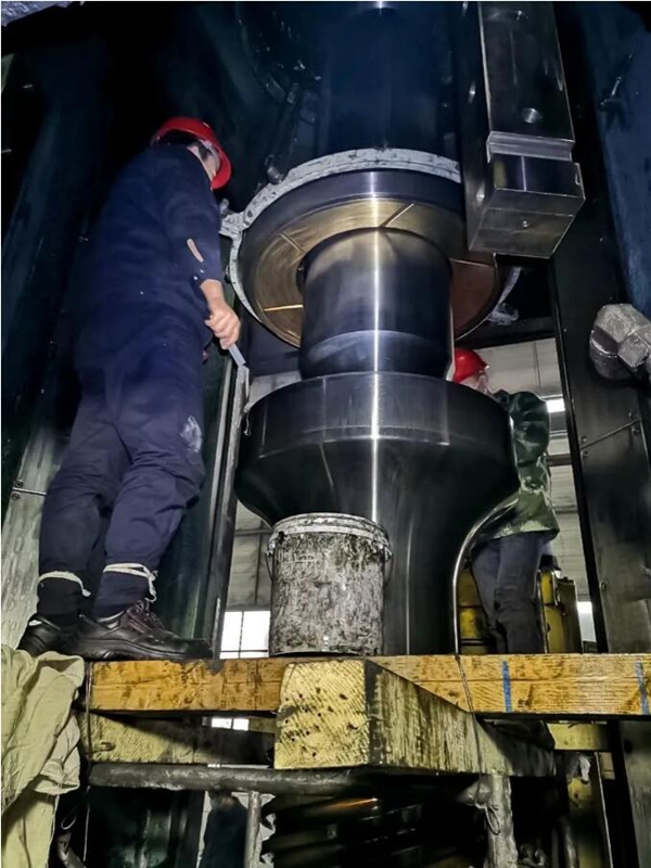 翻新改造现场 中德联动,灵活协作,多方共赢 实现改造时间大幅缩短的另一大原因,是舒勒克服疫情管制影响,协调了德国专家飞来中国进行技术服务,在中国进行配件的本土化定制制作和生产组装。 “如果去德国做好再运回来,不仅运输成本很高,时间也等不起,再加上疫情,不知道要停机多久,这样会给客户造成很大的损失。”孟坤介绍说,“舒勒大连有自己的工厂,我们和客户一起专程去德国调研,讨论后确定在大连工厂也能进行定制。” 但是由于配做的难度很大,飞轮很重,螺杆与飞轮连接的状态必须非常接近,精度要求很高,所以得重新设计56个梢子和配件连接在一起,这需要舒勒德国独特的工艺技巧来完成。经过多轮沟通和争取,舒勒德国、舒勒中国、舒勒大连决定三方密切协作:舒勒德国负责技术指导;舒勒中国负责定制维修方案;舒勒大连负责零部件配装。