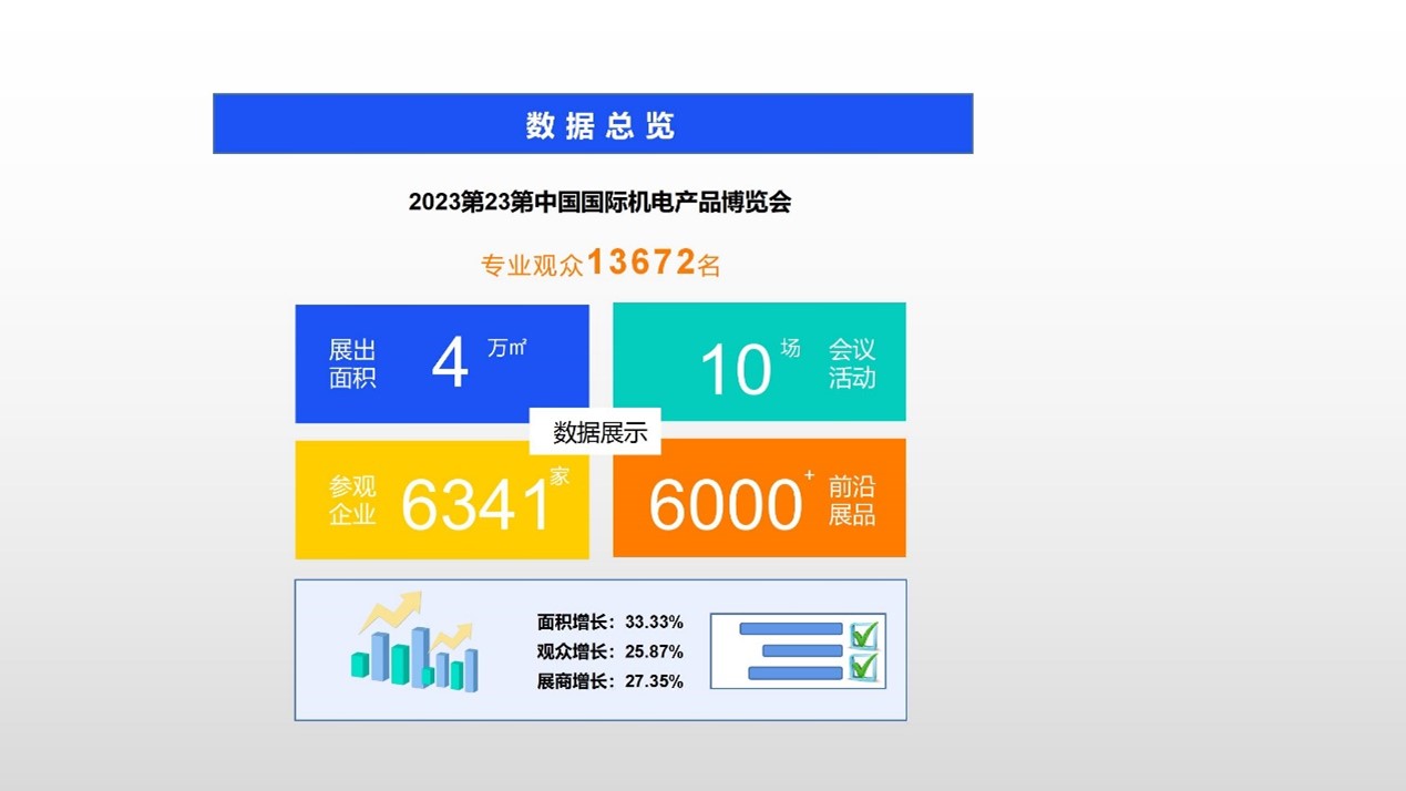 据统计数据显示:在4天展期内,共计近100家商会协会、工业园区、大型企业组团参观;有13672名来自日本、新加坡、印度以及国内6341家大中小型企业的专业观众、采购商莅临现场参观采购。 观众人数:13672 展商数量:461家 参观企业:6341家 展会面积:40000㎡ 论坛活动:10场 前沿展品:6000+ 较上届: 面积增长:33.33% 观众增长:25.87% 展商增长:27.35%