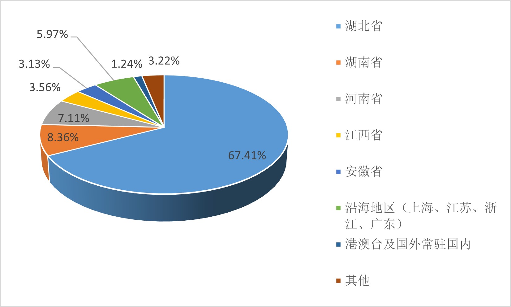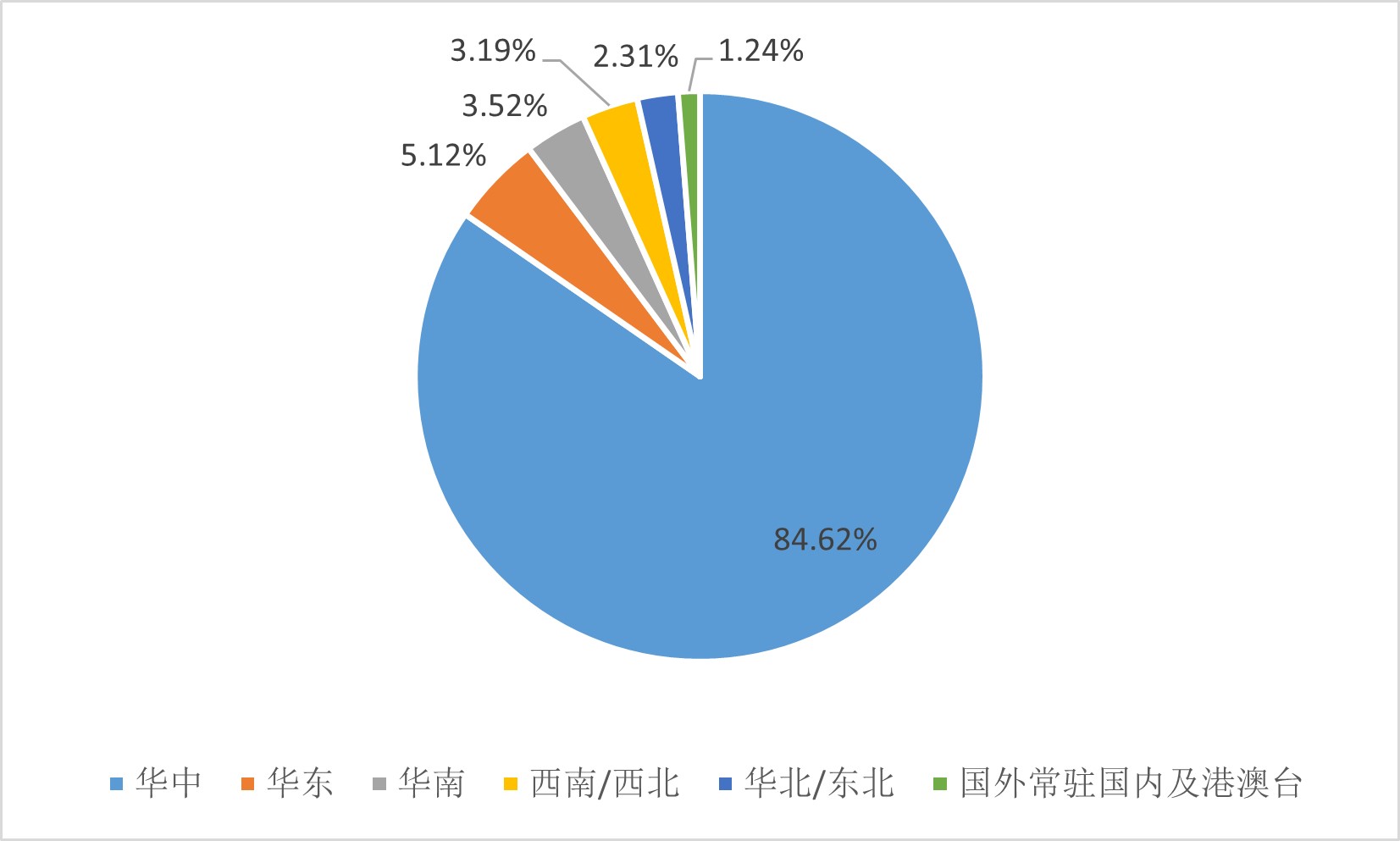 华中 84.62% 11569 华东 5.12% 701 华南 3.52% 481 西南/西北 3.19% 436 华北/东北 2.31% 316 国外常驻国内及港澳台 1.24% 169