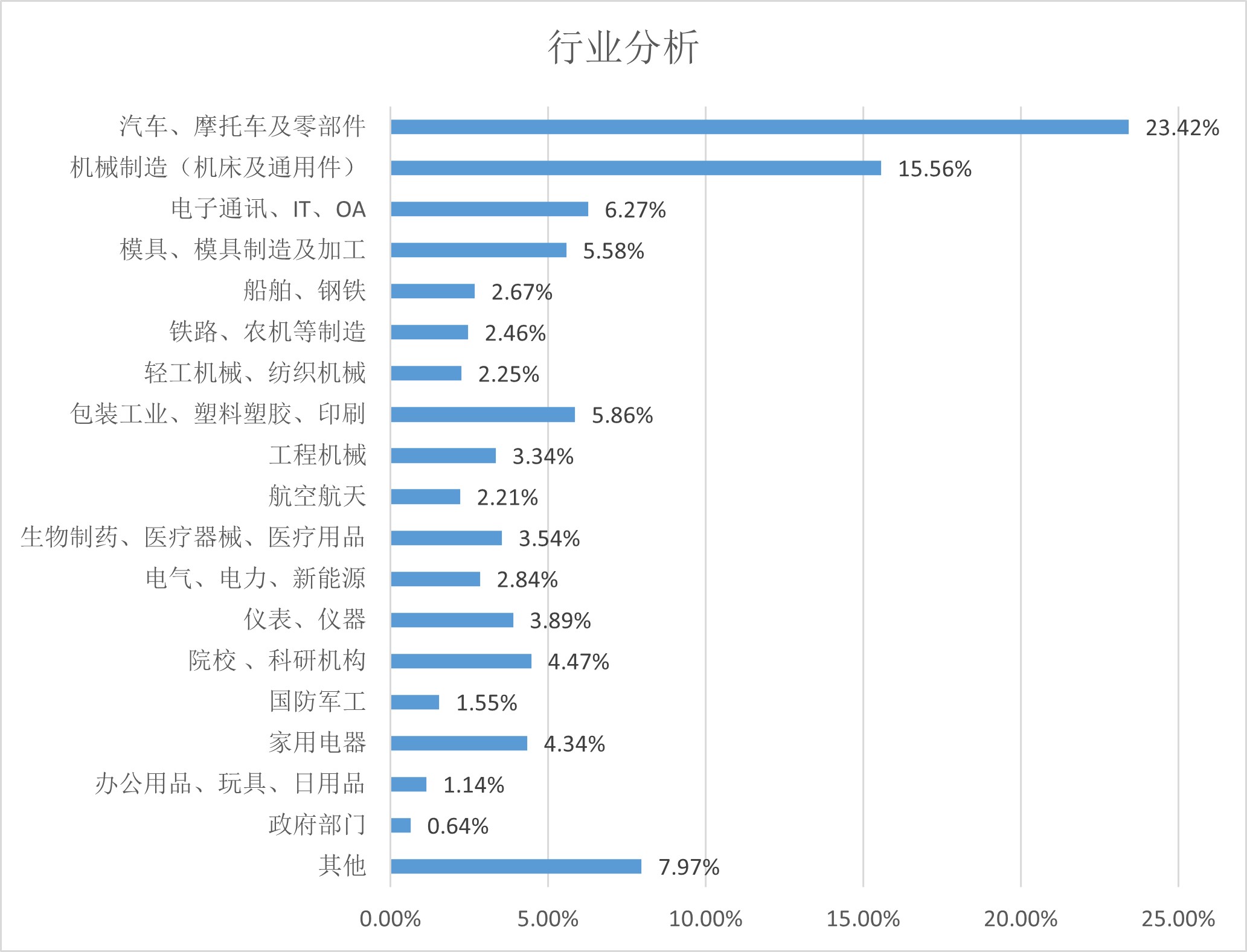 湖北省 67.41% 9216 湖南省 8.36% 1143 河南省 7.11% 972 江西省 3.56% 487 安徽省 3.13% 428 沿海地区(上海、江苏、浙江、广东) 5.97% 816 港澳台及国外常驻国内 1.24% 169 其他 3.22% 441 2.观众所在行业 参观展会的企业行业,以汽车、摩托车及零部件企业最多,占到总数的23.42%,其次为机械制造(机床及通用件),占15.56%。此外,电子通讯、模具、船舶、钢铁、铁路、农机、轻工、橡塑包装、工程机械、国防军工、航空航天、生物医药、家电等制造行业均有涉及。