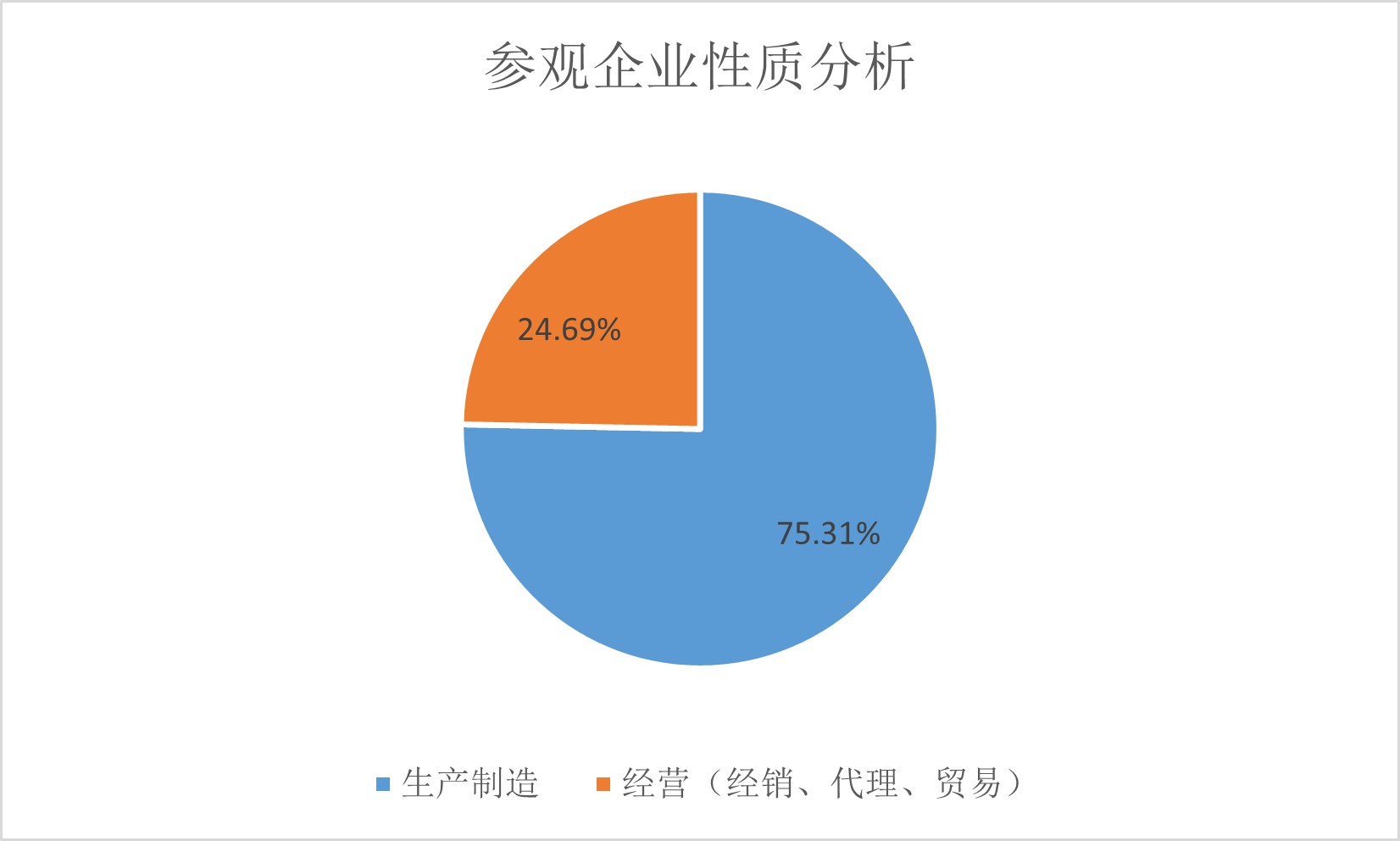 汽车、摩托车及零部件 23.42% 机械制造(机床及通用件) 15.56% 电子通讯、IT、OA 6.27% 模具、模具制造及加工 5.58% 船舶、钢铁 2.67% 铁路、农机等制造 2.46% 轻工机械、纺织机械 2.25% 包装工业、塑料塑胶、印刷 5.86% 工程机械 3.34% 航空航天 2.21% 生物制药、医疗器械、医疗用品 3.54% 电气、电力、新能源 2.84% 仪表、仪器 3.89% 院校 、科研机构 4.47% 国防军工 1.55% 家用电器 4.34% 办公用品、玩具、日用品 1.14% 政府部门 0.64% 其他 7.97% 3.参观企业性质 据展会组委会统计,本次展会参观企业达6341家,从企业性质总数量占比来看,生产制造企业占75.31%,经营(经销、代理、贸易)企业占24.69%,两者合计占100%。由此可以看出,在参观企业中,以生产制造企业为主,占比较大。