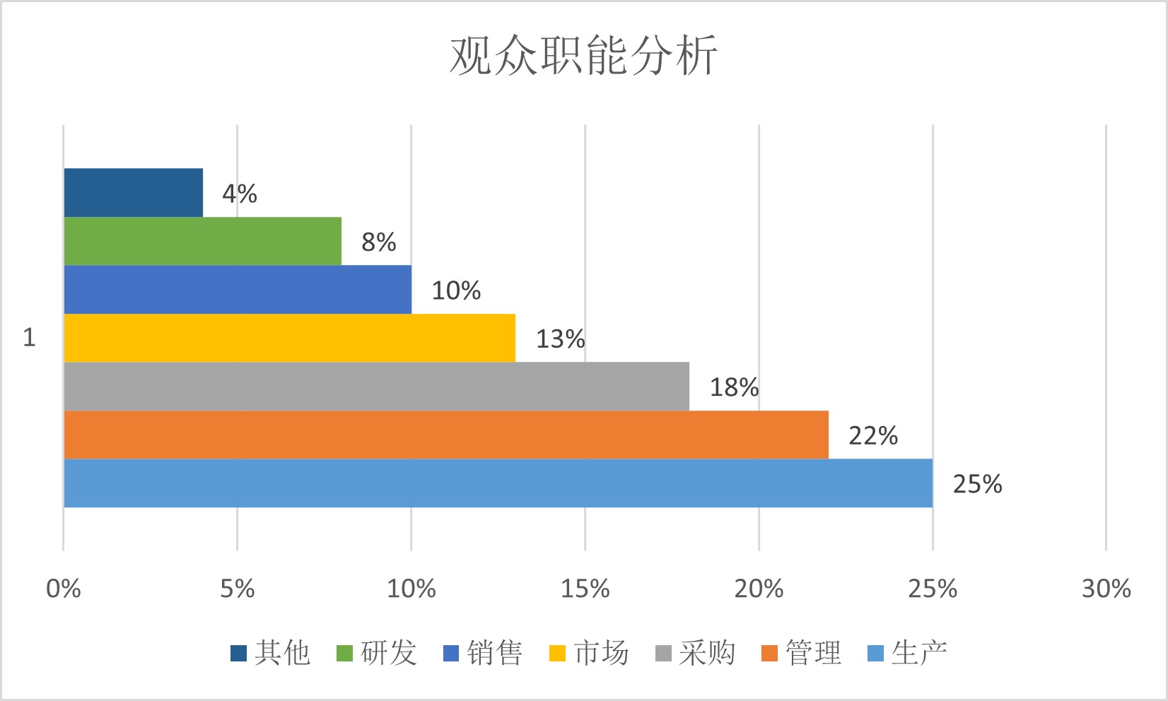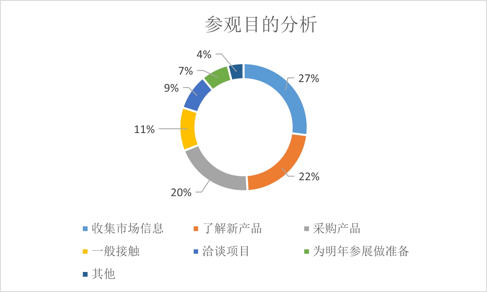 生产 25% 管理 22% 采购 18% 市场 13% 销售 10% 研发 8% 其他 4% 4.参观目的 专业观众的参观目的有“收集市场信息”“了解新产品”“采购产品” “一般接触”“洽谈项目”“为明年参展做准备”,比重依次降低。