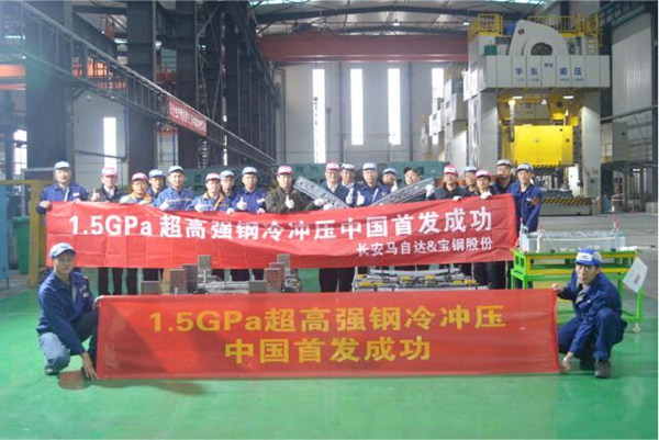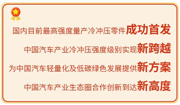 2023年11月9日,国内首个面向量产采用1.5GPa吉帕钢®冷冲压零件成功试冲,该零件采用宝钢全球首发吉帕钢®HC1000/1470DP,是宝钢股份与长安马自达、核心零部件及模具制造企业长期稳定战略合作、持续开展新材料联合研发应用、供应链深度协同攻关结出的创新硕果,将中国车企、冲压厂、模具厂和钢厂协同创新提升到新的高度,解决了世界冷冲压最高强度级别1.5GPa从材料、零件设计、模具设计、模具材料、零件成形及量产全产业链卡脖子问题,实现了先进超高强钢冷冲压技术的全球同步。