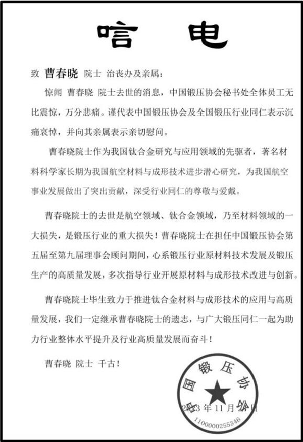 转发讣告如下: 讣 告 中国共产党的优秀党员、中国科学院院士、著名钛合金专家、材料科学家、中国钛合金研究与应用的创始人之一,中国航发北京航空材料研究院研究员曹春晓同志,因病医治无效,于2023年11月23日凌晨1时30分在北京逝世,享年89岁。 曹春晓院士遗体告别仪式定于2023年11月27日上午10:00整在八宝山殡仪馆兰厅举行。 谨此沉痛讣告。