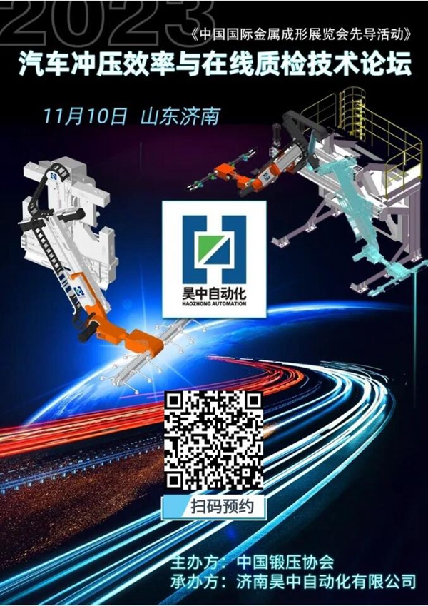 直播开始时间 2023年11月10日 08:20 直播主题 2023汽车冲压效率与在线质检技术论坛 主办方:中国锻压协会 承办方:济南昊中自动化有限公司 直播内容提要 1.参会领导及技术人员采访 2.论坛技术报告讲解 3.新工厂车间参观 PC端观看地址 https://www.vidue.cn/jt/yy.php?id=359 相关咨询 王进超 先生 手机:18071900925 邮箱:wangjinchao@chinaforge.org.cn