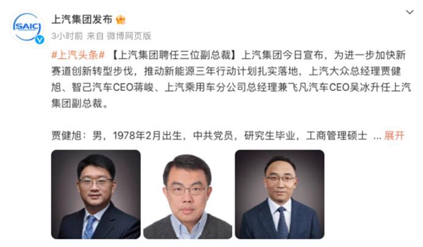 公开资料显示,贾健旭出生于1978年,今年45岁,现任上汽大众汽车有限公司总经理、党委副书记。今年2月,上汽大众宣布陈贤章调任上汽集团副总经济师、技术委员会副主任,不再担任上汽大众总经理,原延锋汽车饰件系统有限公司总经理贾健旭接任上汽大众总经理一职。也就是说,不到一年时间,贾健旭再次被提拔为集团副总裁。 蒋峻和吴冰也是70后,前者出生于1970年,后者则出生于1976年,从工作履历来看,两人均在上汽体系内任职多年。其中,蒋峻现任智己汽车科技有限公司CEO;吴冰现任上海汽车集团股份有限公司乘用车分公司总经理,飞凡汽车科技有限公司CEO。 上汽集团官网显示,目前上汽集团已有五位副总裁,分别为周郎辉、蓝青松、卫勇、祖似杰和杨晓东。其中,周郎辉、卫勇和杨晓东均为70后。而此次上汽集团聘任的三位副总裁也均为70后,这也意味着上汽集团管理团队将更加年轻化。截至发稿前,上汽集团官网尚未更新此次最新人事变动。