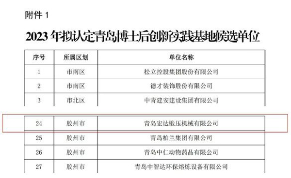 7月27日,青岛市人力资源和社会保障局对2023年“青岛市博士后站(基地)和青岛市专家工作站拟认定单位”进行了公示,公示期3个工作日。青岛宏达锻压机械有限公司正式认定为--青岛博士后创新实践基地。