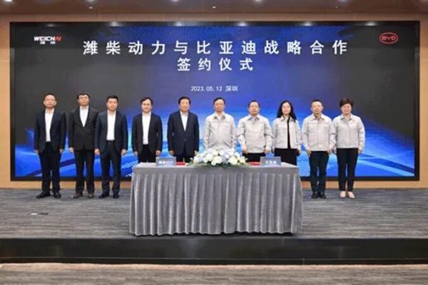 5月12日上午,潍柴动力与比亚迪在深圳签署战略合作协议,潍柴动力董事长、CEO谭旭光,比亚迪董事长兼总裁王传福出席活动并见签。