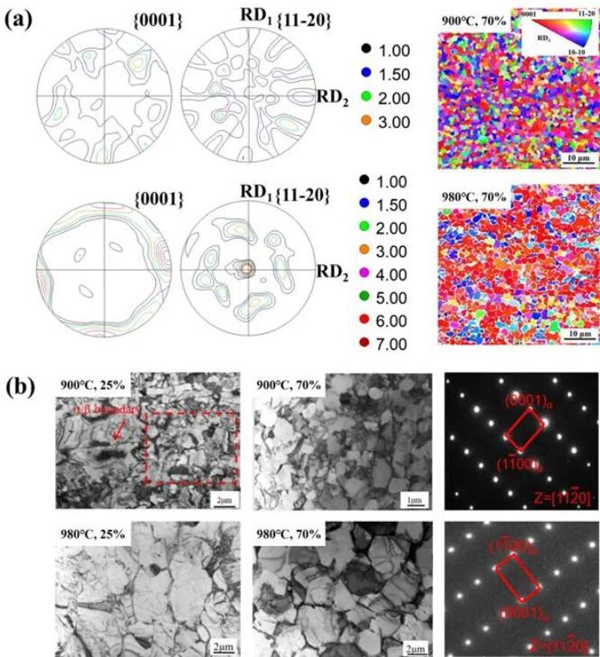 图1 α相的球化机制与微织构的形成联系:(a)不同变形温度试样宏观织构;(b)α相晶体取向分布;(c)TEM明场像及选区电子衍射图像 为进一步提高钛合金棒材和锻件的性能及其稳定性,中国科学院金属研究所轻质高强材料研究部高温钛合金团队针对钛合金锻造组织中微织构的形成和演化机制开展了系统的研究工作。通过对具有板条状组织Ti60钛合金的热压缩实验,研究了两相区变形初始阶段α相的球化机制及其晶体取向的演化规律(图1),发现当板条α相晶内沿正交方向的滑移累积足够的变形时,α相板条内形成的亚晶尺寸远小于其自身宽度,亚晶可通过聚合过程累积足够的取向差,此时板条α相以连续再结晶机制球化得到取向分散的等轴α相。在较高温度变形时,板条α相的晶内滑移较少,形成亚晶的尺寸与板条α相宽度相当,此时板条α相的球化方式以“晶界分离”机制为主,同一板条α集束球化后一般仍保留相近的晶体取向。