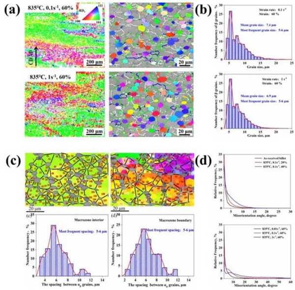 图2 微织构“顽固性”与初生α相钉扎作用联系:(a)高变形量和高变形速率条件下的初生α相和β相晶体取向;(b)β相晶粒尺寸分布;(c)初生α相间距测量及分布;(d)β相取向差分布 此外,钛合金锻造组织中的微织构在后续热加工过程中具有较强的“顽固性”,主要表现为原始β晶粒的晶体取向很难随机化,甚至后续经过十几火次的反复镦拔变形也很难消除。本团队通过对TC17合金双态组织中微织构演化规律的研究(图2),发现初生α相的钉扎作用是导致原始β晶粒的晶体取向表现出强“顽固性”的主要原因。初生α相的钉扎作用限定了β晶粒生长,有利于β晶粒尺寸的均匀化,但也阻碍了β亚晶的聚合过程,限制了原始β晶粒取向的随机化。研究团队通过分析β晶粒内亚结构随变形参数的演化规律,讨论了在初生α相钉扎作用下各变形参数对β相晶体取向的影响,为理解钛合金具有较强组织遗传性的机制提供了新视角。