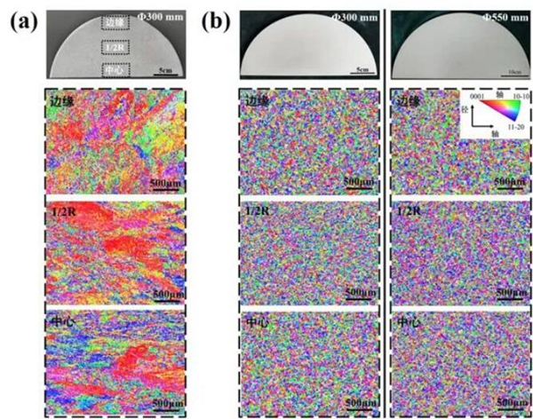 图3 锻造工艺优化前后棒材晶体取向对比:(a)优化前Φ300mm棒材低倍组织及其晶体取向;(b)优化后Φ300mm和Φ550mm棒材低倍组织及其晶体取向 基于以上认识,研究团队结合不同体系钛合金晶体取向的演化特点,对钛合金的锻造工艺进行了系统梳理,开展了TC25G、Ti60、Ti65、Ti2AlNb和TC11等钛合金相关基础研究结果近期在Metallurgical and Materials Transactions A上在线发表,题为“Influence of Globularization Process on Local Texture Evolution of a Near-α Titanium Alloy with a Transformed Microstructure”和“Microtexture Evolution of Titanium Alloy During Hot Deformation: For Better Understanding the Role of Primary α Grains”。论文的第一作者为赵子博研究员,通讯作者为王清江研究员,刘建荣研究员指导了实验的设计,杨锐研究员指导了整个研究工作。该工作得到了某专项基础研究、青促会人才专项和中科院稳定支持青年团队等项目的资助。 来源:中国科学院金属所 |