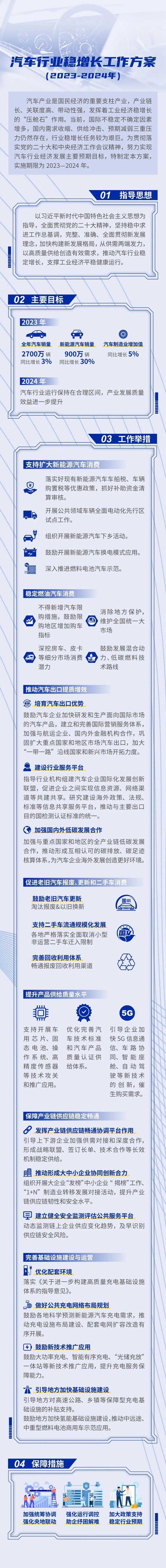 汽车行业稳增长工作方案(2023—2024年) 汽车产业是国民经济的重要支柱产业,产业链长、关联度高、带动性强,发挥着工业经济稳增长的“压舱石”作用。当前,国际不稳定不确定因素增多,国内需求收缩、供给冲击、预期减弱三重压力仍然存在,行业稳增长任务较为艰巨。为贯彻落实党的二十大和中央经济工作会议精神,努力实现汽车行业经济发展主要预期目标,特制定本方案,实施期限为2023—2024年。一、指导思想 以习近平新时代中国特色社会主义思想为指导,全面贯彻党的二十大精神,坚持稳中求进工作总基调,完整、准确、全面贯彻新发展理念,加快构建新发展格局,从供需两端发力,以高质量供给创造有效需求,推动汽车行业稳定增长,支撑工业经济平稳健康运行。二、主要目标 2023年,汽车行业运行保持稳中向好发展态势,力争实现全年汽车销量2700万辆左右,同比增长约3%,其中新能源汽车销量900万辆左右,同比增长约30%;汽车制造业增加值同比增长5%左右。2024年,汽车行业运行保持在合理区间,产业发展质量效益进一步提升。