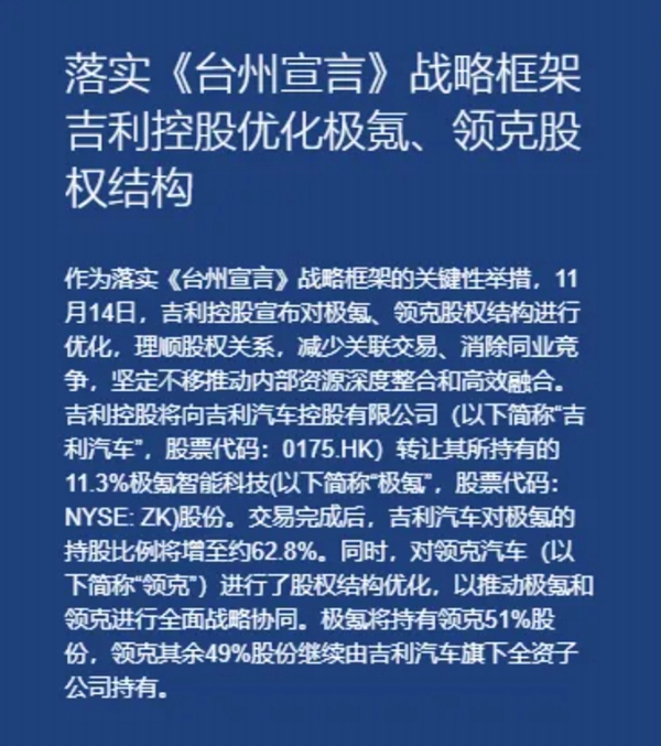 吉利旗下两大品牌极氪与领克正式官宣合并。11月14日,吉利控股集团宣布,作为落实《台州宣言》战略框架的关键性举措,对极氪、领克股权结构进行优化。吉利控股集团将向吉利汽车控股有限公司转让其所持有的11.3%极氪股份。交易完成后,吉利汽车对极氪的持股比例将增至约62.8%。
