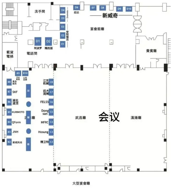 展示企业如下: D7-D10 武汉新威奇科技有限公司 D6 应达工业(上海)有限公司 D3-D4 Enomoto Machine Co., Ltd E3-E1安阳锻压(集团)机械工业有限公司 D2 隔而固(青岛)振动控制有限公司 D1 浙江阿波罗工具有限公司 C8 重庆江东机械有限责任公司 C7 青岛远大润烯科技有限公司 C6 菲尔斯精密成型技术(苏州)有限公司 C5 韩国(株)东山工业 C4 Metal Forming Research Corporation(MFRC) C3 镐成机械工业(株) C2 浙江精卫特机床有限公司 B10 山东圣德智能装备有限公司 B9 中山市万达机械自动化科技有限公司 B8 青岛浩源益友锻压机械有限公司 B7 斯凯孚(中国)销售有限公司 B6 湖北凌顶科技有限公司 B5 株式会社栗本铁工所 B4 QFormGroup B3 JNH Press Co., Ltd B2 故城县风动摩擦密封材料有限公司