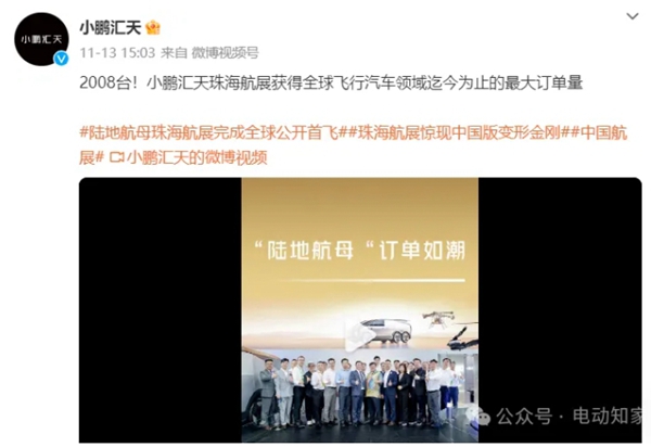 电动知家消息,近日,小鹏汇天在第十五届中国国际航空航天博览会上举办“陆地航母”飞行汽车批量预订签约仪式,与来自全国各地不同行业的12家批量预订意向客户签署合作及产品预订协议。本次签约的新订单共计2008台。官方表示,这是全球飞行汽车领域迄今为止的最大订单量。