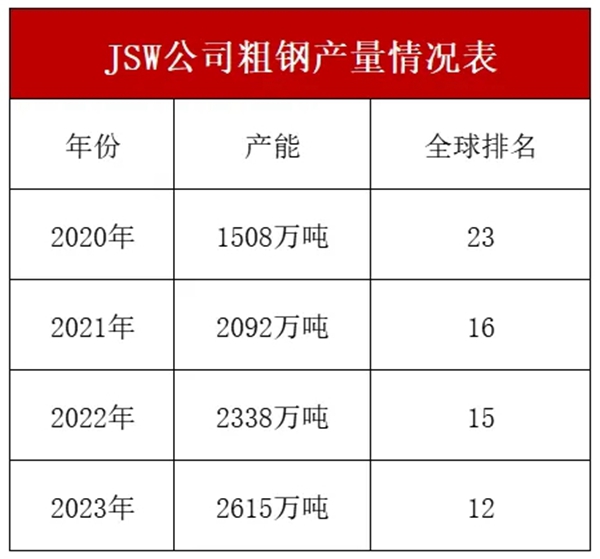 剑指5000万吨级 2024年1月25日,辽宁方大集团董事局主席方威在一会议上指出,集团钢铁板块最终的发展目标要达到5000万吨产能,市场下行的时候是实施并购重组的好机遇。 继方威提出5000万吨产能目标后,近日媒体报道,印度JSW公司计划于2030/31财年实现5150万吨目标。 JSW公司隶属于印度京德勒集团,是目前印度规模最大的钢铁企业,主要从事矿山开采、钢铁生产及钢材加工配送服务。JSW公司的发展战略是大规模扩大国内钢铁产能。媒体报道,该公司2023/24财年的炼钢产能(包括印度和海外)为2970万吨,计划在2024/25财年提高至3820万吨,到2030/31财年进一步提升至5150万吨。 JSW公司大动作不断,进一步扩大产能 1.产能保持增长态势 根据JSW Steel 10月10日发布的财报,2024-25财年第二季度该公司在印度的粗钢产量达到663万吨,创下季度新高。 第二季度,JSWSteel成功启用了位于奥里萨邦 Bhushan Power and Steel (BPSL)工厂的100万吨/年的扩建项目,将粗钢总产能提升至450万吨。此外,在第二季度末,其全资子公司JVML在毗奢耶那伽罗启用了一座年产450万吨的高炉。 此外,烧结厂和钢熔车间正处于不同的调试阶段,一旦全面投入运营,毗奢耶那伽罗的粗钢总产能将增至1750万吨/年,同时将JSWSteel在印度的粗钢总产能从2920万吨/年提升至3420万吨/年。 2.收购公司 2024年10月18日,印度京德勒西南钢铁公司(JSWSteel)宣布其全资子公司已签署协议,正式收购蒂森克虏伯电工钢印度有限公司100%的股权。 3.建立联合钢铁厂 近日媒体报道,印度京德勒西南钢铁公司(JSW公司)与韩国POSCO集团签署了一份谅解备忘录,将在印度建立一家联合钢铁厂。 搅动世界钢铁格局 根据世界金属导报公布的数据来看,近年来,JSW公司粗钢产量保持增长态势,在世界知名钢铁企业中占据重要地位。