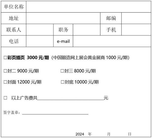 其中刊内可提供企业彩页宣传,是各优秀企业宣传产品的理想途径,欢迎有需要的企业踊跃刊登广告,数量有限,先到先得。 ![]() 刊登咨询 罗文会 女士 手机:13343131143(同微信)邮箱:luowenhui@chinaforge.org.cn 刊登广告及信息回执单