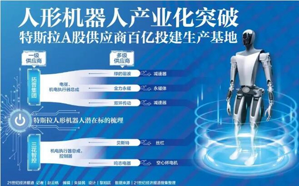 前瞻性布局 值得注意的是,在疑似配套特斯拉人形机器人之前,三花智控、拓普集团均未配套过机器人主机企业,是机器人行业的“新兵”。 而在此次公告中,两家公司均未明确表示投资生产基地的计划为配套人形机器人。 不过市场依然能从两家披露投资计划的蛛丝马迹中,找到其配套人形机器人的可能性。 从产业逻辑上来看,不论是工业机器人还是人形机器人,他们存在配件通用的概念,两者的核心组件也都包括电机电驱、执行器和控制器等。 而从商业化的角度,截至目前,工业机器人主要应用于工业制造领域,行业涵盖能源、汽车、3C制造等等,也是泛机器人行业商业化落地最早、最普及的行业。 相比之下,人形机器人是否真有马斯克曾经描述的“万亿”市场,还要打上一个问号。 不过,从投资规模的角度,行业又普遍认可两个“50亿”,势必与人形机器人有莫大关联。 比如,三花智控在公告中称,先途电子拟在钱塘区投资建设先途智能变频控制器生产基地项目,计划总投资不低于12亿元;公司拟在钱塘区投资建设机器人机电执行器和域控制器研发及生产基地项目,计划总投资不低于38亿元。 拓普集团则表示,50亿投资计划中,30亿元为固定资产投资。 对此,高工机器人产业研究所所长卢瀚宸告诉记者,虽然从产业逻辑上,两家企业的产品确实可以配套包括协作机器人在内的工业机器人。但从金额和体量上,相应的投资规模又很难仅通过工业机器人来消化。因此两项计划均大概率为针对人形机器人领域的前瞻性布局。 “协作机器人市场暂时还不足以支撑起这么大的需求量,所以大概率是为人形机器人项目做前瞻性布局,”卢瀚宸告诉记者,“从当前公司对外的回复信息看,50亿投资中以投向新能源汽车领域的域控制器项目占比最大。之所以布局机器人业务,是因为公司部分原有客户进入了这个行业,公司正在积极跟随。此外,50亿投资会分多年进行,机器人业务则为前瞻性布局,将会视为未来的核心业务之一进行培育。” 来源:21财经 |