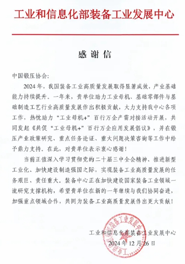 工信部装备工业发展中心向中国锻压协会发来感谢信!