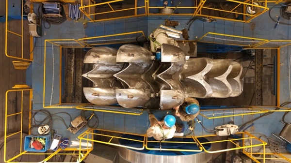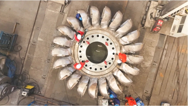 冲击式水轮机是用压力管道引导水流冲击式转轮进行能量转换的水力机械,电站落差大、压力高。扎拉电站设计水头671米,转轮是直接影响机组效率和最重要的受力部件及通流部件之一。在机组运行状态下,时刻承受高频率的动态压力,对机组的稳定运行和安全起着至关重要的作用,焊接制造要求极为严苛。 作为世界单机容量最大冲击式机组转轮,其轮毂锻件直径尺寸为4.7米、厚度达1米,创造了马氏体不锈钢最大锻件世界纪录;加工后的转轮最大外径6.23米、最大宽度1.34米,也是冲击式转轮世界之最;且由于材质、型状、尺寸等原因,焊接、加工等环节的制造技术,都处于相关领域的前沿,探索制造的过程,存在很多风险因素和不确定性,焊接制造要求极高、难度极大。