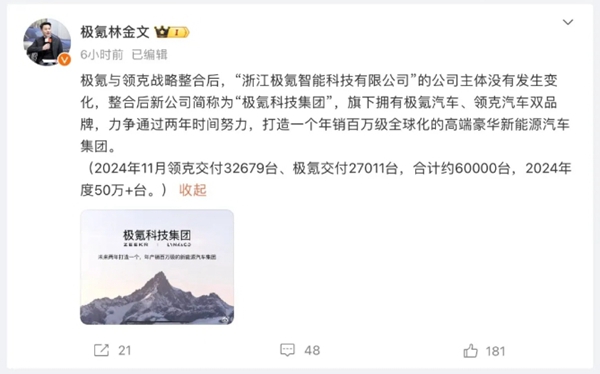 12月3日,极氪智能科技副总裁林金文在其个人社交媒体上发文称,极氪与领克战略整合后,“浙江极氪智能科技有限公司”的公司主体没有发生变化,整合后新公司简称为“极氪科技集团”,旗下拥有极氪汽车、领克汽车双品牌,力争通过两年时间努力,打造一个年销百万级的全球化高端豪华新能源汽车集团。
