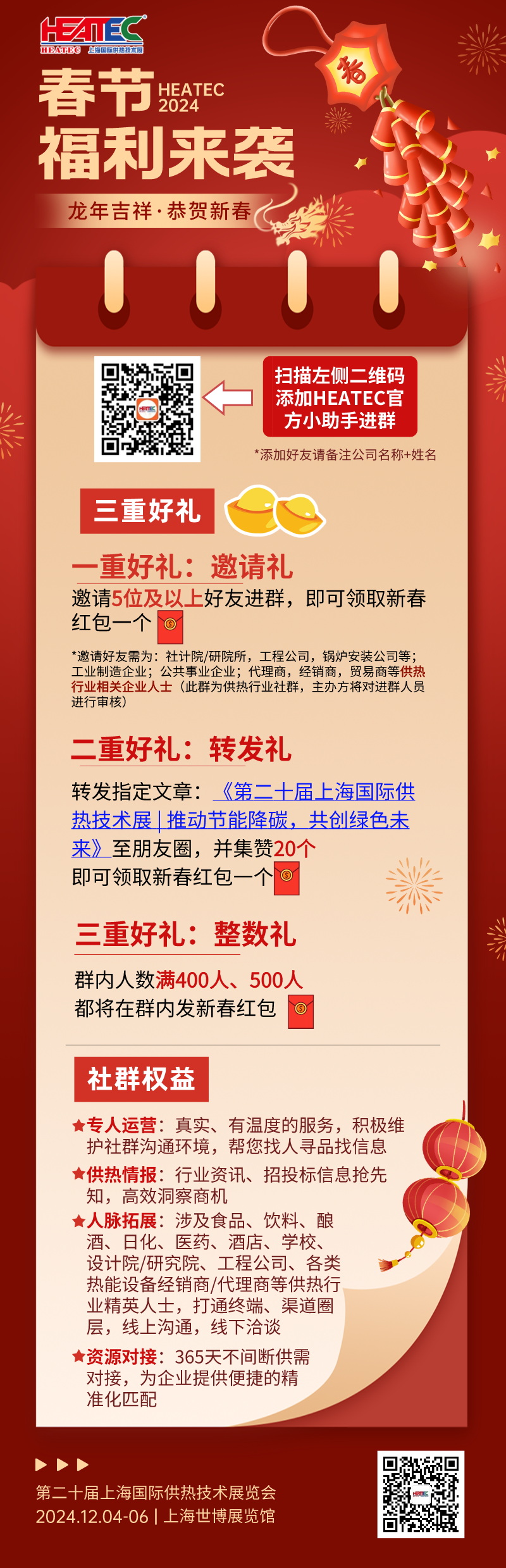第二十届上海国际供热技术展(HEATEC 2024)将在12.04-06在上海世博展览馆举办,有些客户会问:“展会要12月才开,现在定展位是不是太早了?” 当然不是,如今越来越多的展商在参展结束当天便提前预定了下一届的展位,这就足以说明抢占先机的重要性! 那么提前占位有什么好处呢? 1、好位置意味好流量,好流量意味好效果 展会中展位位置各异,不同的位置带来的客流量和推广效果也不尽相同,企业需要根据自身参展需求及预算,合理选择适合自己的位置和面积。然而,完美符合企业要求的展位是有限的,如果想要挑选一个合适的位置,就要抢占先机,以免被其它企业抢定,最后自己只能采取备选方案。 越早抢订,留给企业的选择空间就越大。 2、巩固老客户,开发新客户,获取更多订单 2023年行业“内卷”比较严重,行业洗牌加速。2024年,为了在行业中宣示存在感,向客户证明企业发展稳定,最好的方式就是参加专业展会。参加展会是产品面向大众的最佳时机,如同登台亮相,展会现场交流带来的信任,是其他任何线上渠道都取代不了的。 主办方深耕行业多年积累了一大批有采购需求的优质买家,因此在预定展位后到展会举办前的这段时间内,主办方将通过各渠道助您吸引优质买家、新的客户群体,为您带来更多询单和订单。越早预定,获取新客户的机会就越多。 3、展位越早预定,享受宣传增值福利也越多 企业参展的一大目的就是宣传产品,提高知名度,从而打开更大的市场。企业提前预定展位后,会被组委会列入到宣传计划和相关宣传资料中,能够更好的借用展会宣传的力量以及展会影响力提升企业知名度,企业也能因此获得更长的宣传期,在推广产品中起到更好的效果。 作为供热行业交流、合作的重要窗口,HEATEC上海国际供热技术展已成为国内极具影响力的供热行业新产品、新技术、新理念的交流盛会之一。第二十届上海国际供热技术展将于2024年12月4日-6日在上海世博展览馆举办,HEATEC深耕行业二十多载,展会影响力辐射全国各大地区,参展企业可以全面迅速地了解市场行情,与各地区的专业买家直接接触,其带来的宣传效益无疑是巨大的! 2024年HEATEC将以“双碳”战略的推动为动力,汇聚行业名优供热企业和创新技术,为新时代的能源转型揭开华丽序幕!共同开启清洁低碳的能源未来,共筑绿色发展的强势壁垒!不容错过的供热行业盛宴,让我们携手迈进绿色、安全、高效的供热新时代!