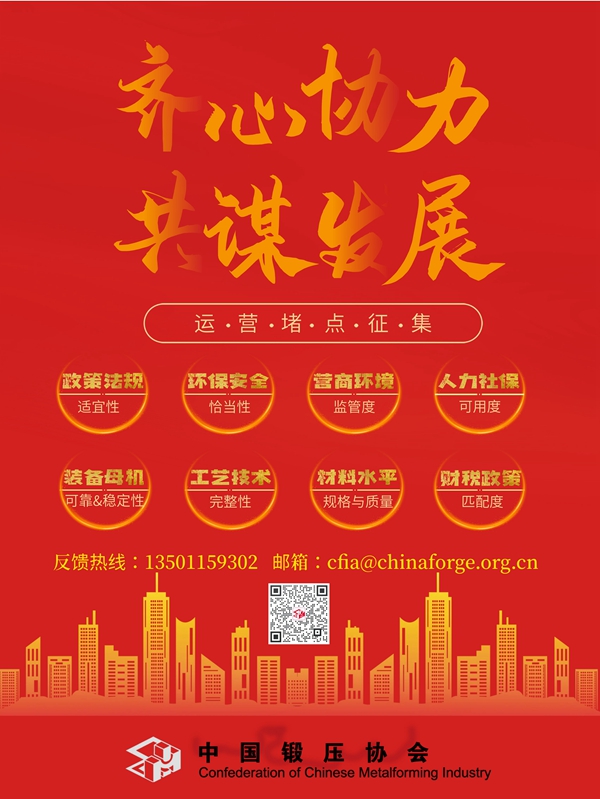 各会员单位、行业内其他企业: 中国锻压协会是锻造、冲压、钣金与制作行业的利益代表,是企业与政府之间的桥梁,向政府反映行业和企业诉求。提出有利于行业发展和行业治理的政策建议和意见是协会存在的价值,也是协会的重要工作内容。基于当前国家治理体系的不断完善,环境保护、劳动安全和双碳工作的需要,地方政府依据已有的法律法规对企业进行监督检查。在这个过程中,由于对法律法规条款理解或解读上的差异,以及锻造、冲压、钣金与制作专业生产的特殊性,一定会有一些不符合行业、企业的规定和要求。中国锻压协会希望广大企业基于实事求是的原则,就遇到的问题及时向中国锻压协会反映,以便中国锻压协会开展调研,形成报告,代表行业与国家主管部门沟通,通过主动沟通、解释、解答,争取正确规范锻造、冲压、钣金与制作行业的环保安全生产。倡导行业广大企业放弃对抗或找关系而带来麻烦,甚至于变相推动权力腐败的行为,积极向中国锻压协会反馈企业运行堵点问题,助力锻压行业健康可持续发展。反馈热线:13501159302 反馈邮箱:cfia@chinaforge.org.cn(邮件主题请注明:企业反馈)
