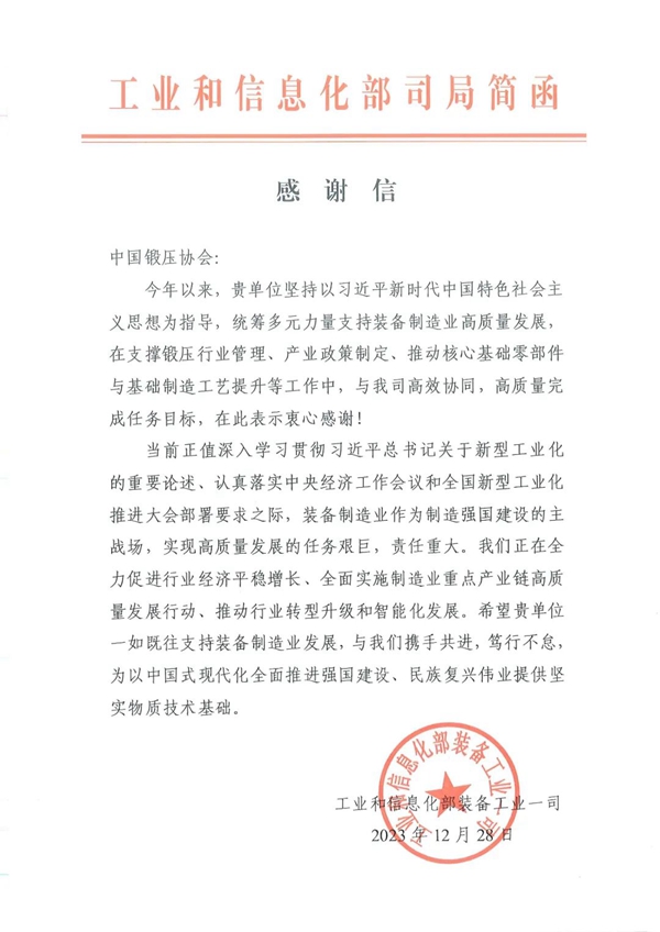 工信部装备工业一司向中国锻压协会发来感谢信