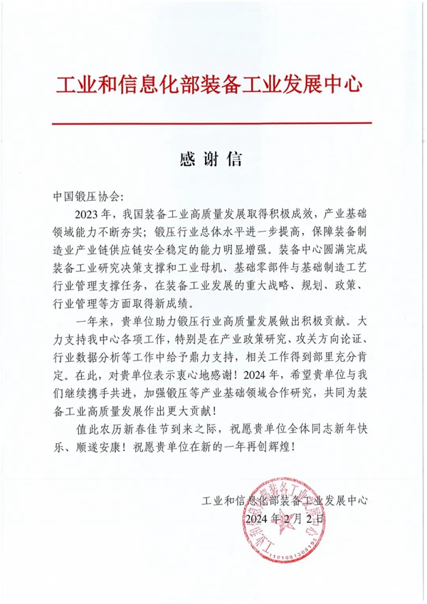 工信部装备工业发展中心向中国锻压协会发来感谢信