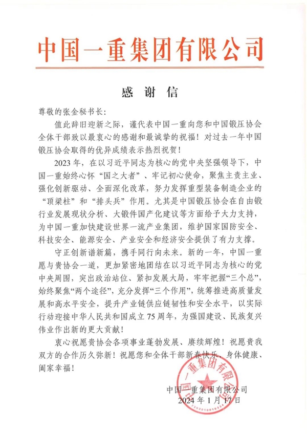 中国一重集团向中国锻压协会发来感谢信