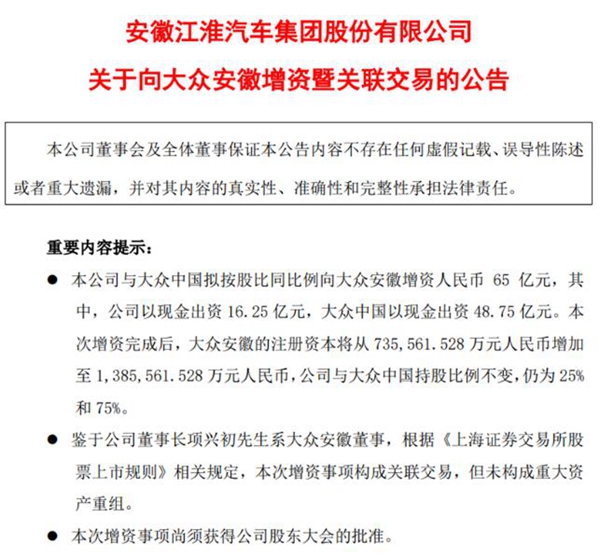 3月12日,江淮汽车发布公告称,公司与大众中国拟按股比同比例向大众安徽增资人民币65亿元,其中,公司以现金出资16.25亿元,大众中国以现金出资48.75亿元。本次增资完成后,大众安徽的注册资本将从735,561.528万元人民币增加至1,385,561.528万元人民币,公司与大众中国持股比例不变,仍为25%和75%。