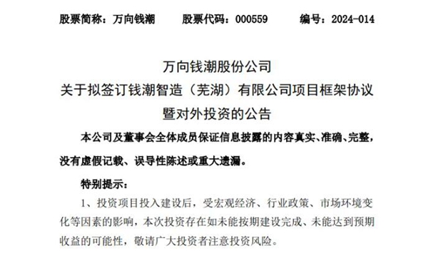 4月18日,万向钱潮(000559)公告显示,拟与芜湖经济技术开发区管理委员会就年产900万支等速驱动轴研发制造项目签订框架协议,项目总投资不超出15亿元。