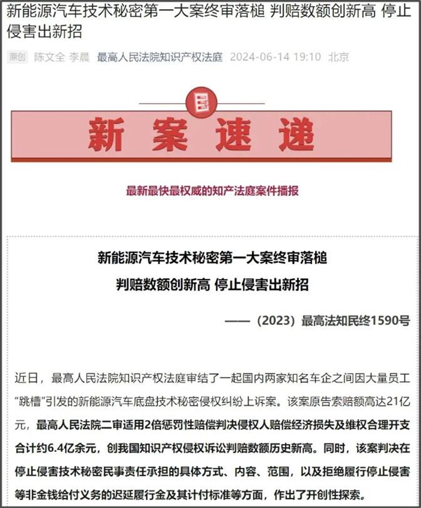 6月14日,最高人民法院知识产权法庭公众号发布的新案速递透露,最高人民法院知识产权法庭近日审结一起国内两家知名车企之间因大量员工“跳槽”引发的新能源汽车底盘技术秘密侵权纠纷上诉案。该案原告索赔额高达21亿元,最高人民法院二审适用2倍惩罚性赔偿判决侵权人赔偿经济损失及维权合理开支合计约6.4亿余元,创我国知识产权侵权诉讼判赔数额历史新高。