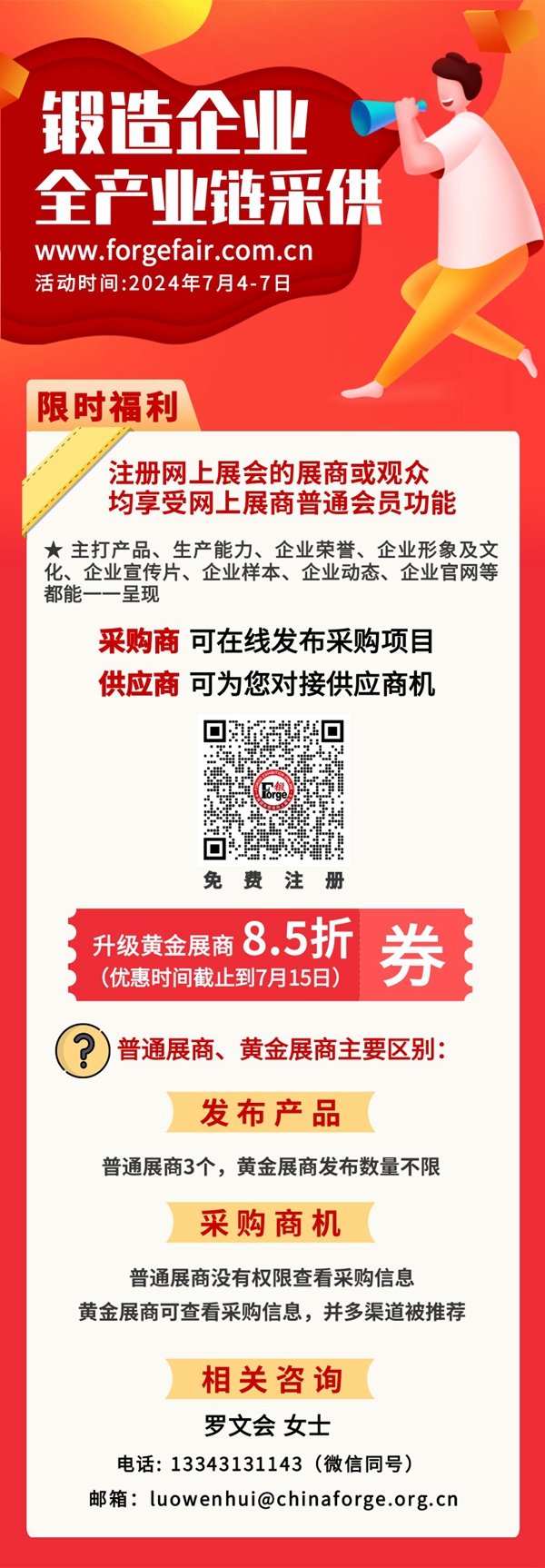 2024年7月4-7日,中国锻压协会将于上海举办2024中国国际金属成形展览会,为更好地促进企业全方位立体化展示和对接,锻造行业全产业链企业采供对接信息平台——中国国际锻造网上展览会(www.forgefair.com.cn)特推出限时福利!