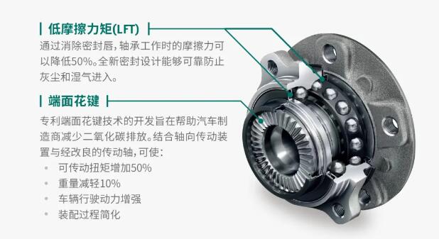 带端面花键的轮毂轴承是舍弗勒轮毂轴承产品系列中的核心产品。得益于端面花键专利技术和低阻力设计,该轴承在摩擦、扭矩传递、轻量化、能耗等方面均有出色表现。与普通设计相比,带端面花键的轮毂轴承传递的扭矩增加50%,重量减轻10%,摩擦降低34%,可使整车能耗降低0.6%。