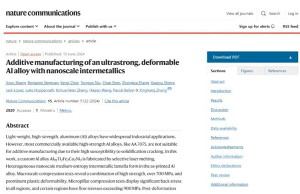 普渡大学材料工程师团队近期开发出一种创新工艺,成功制造出适合增材制造(3D打印)的超高强度铝合金。该工艺利用纳米级、层状的可变形金属间化合物,将钴、铁、镍和钛等过渡金属引入铝中,从而开发出一种兼具高强度和良好塑性变形能力的新型铝合金。