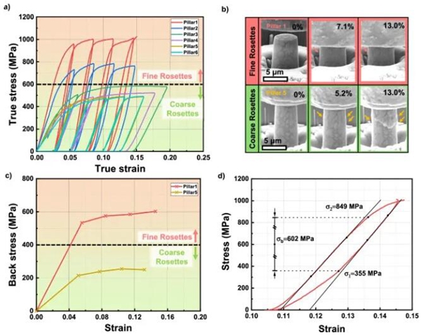 通过该3D打印超高强度铝合金制作的样品,图片来自:普渡大学 研究团队对所开发的铝合金进行了多项测试,包括宏观压缩试验、微柱压缩试验和后变形分析。测试结果显示,该铝合金在宏观测试中表现出显著的塑性变形能力和高强度,强度超过900兆帕。